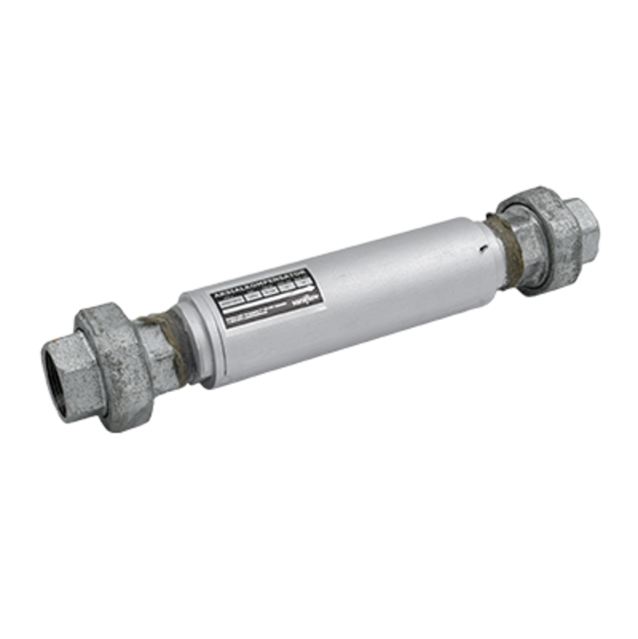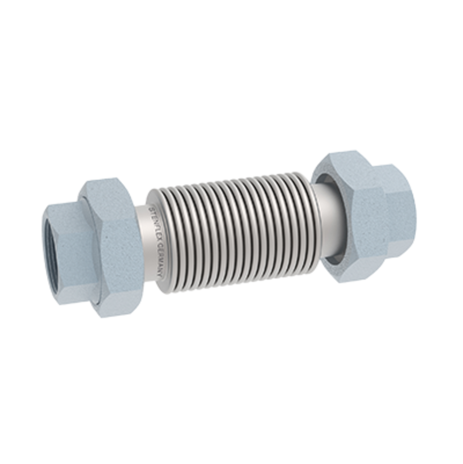 Vakuum-tæt stål-kompensator bestående af rustfri-stålbælg og forbindelsesstykker med gevind Bælg med udkravede ender, forbindelsesdele med union og pakkeflade. Unioner med indvendigt gevind.